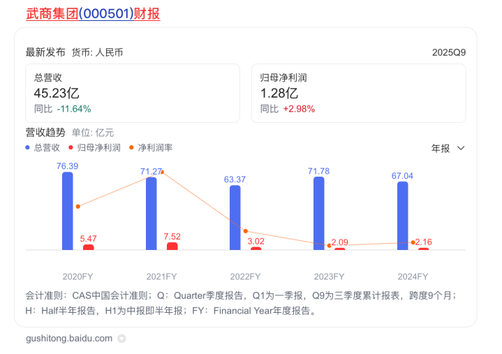 2020-2024年,武商集团营收分别约76.39亿、71.27亿、63.37亿、71.78亿、67.04亿元;归母净利润分别约5.47亿、7.52亿、3.02亿、2.09亿、2.16亿元。今年前三季度,该公司营收45.23亿元,归母净利润1.28亿元,净利润率2.83%。截至今年9月底,其总资产310.5亿元,净资产109.6亿元,资产负债率65%。截至今日收盘,武商集团跌3.15%报9.85元/股,总市值75.75亿元。